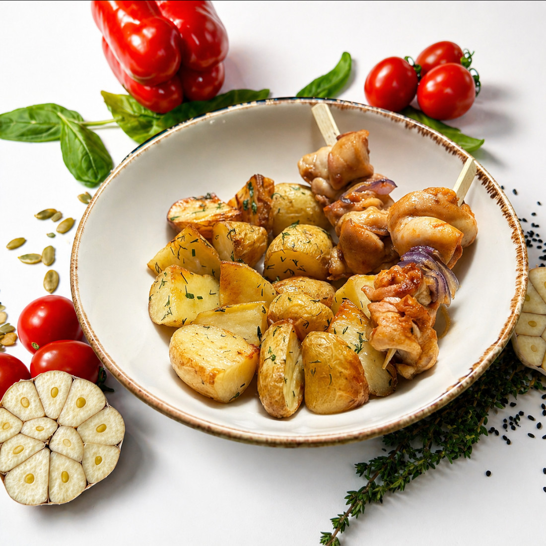 Склад:Курячий шашлик, молода картопля , червона цибуля, спеції , соєвий соус, мікрогрін.