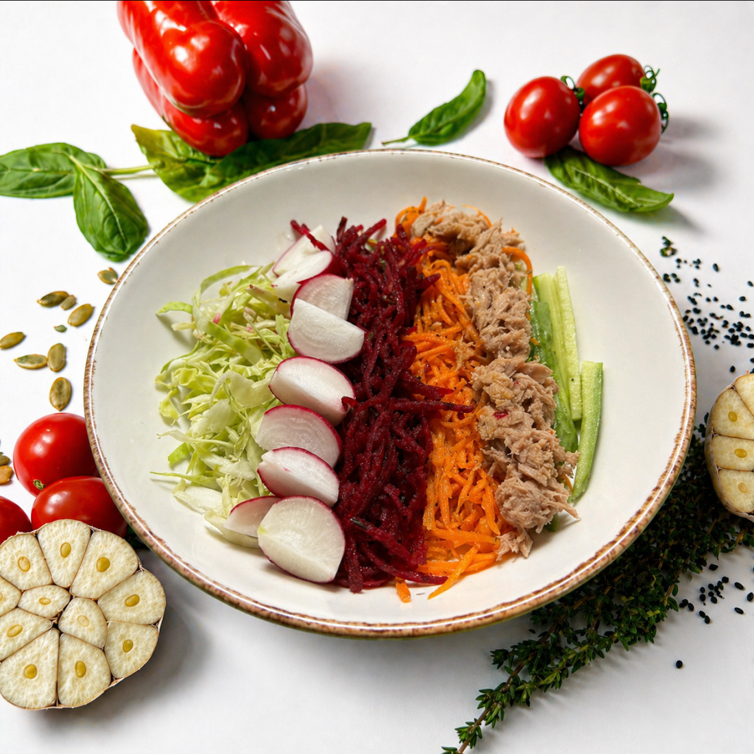 Склад:Капуста молода білокачанна, буряк та морква мариновані, тунець консервований, огірок свіжий, редиска, гарбузове насіння, соус Айолі.