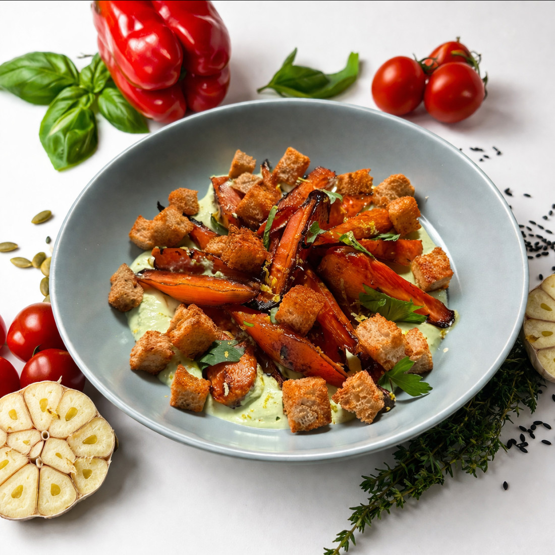 Склад:Зутатен ніжна, кисломолочна основа на грецькому йогурті та сирі, з печеною морквою в соусі Унагі з цедрою лимону